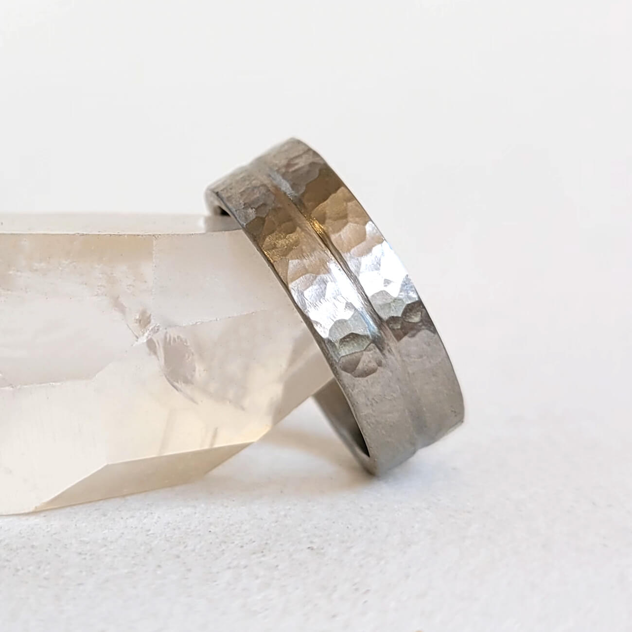 Clean lines meet organic texture in this handcrafted hammered platinum band with a sleek, carved center channel. Durable and hypoallergenic, it’s designed for lasting comfort and everyday wear.