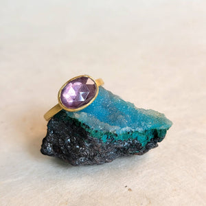 Color me happy with this oval pink sapphire in a sea of yellow gold! The warm gold is perfect frame for this sweet rose cut sapphire with its hints of purple undertone. Add a diamond band for a complete set.
