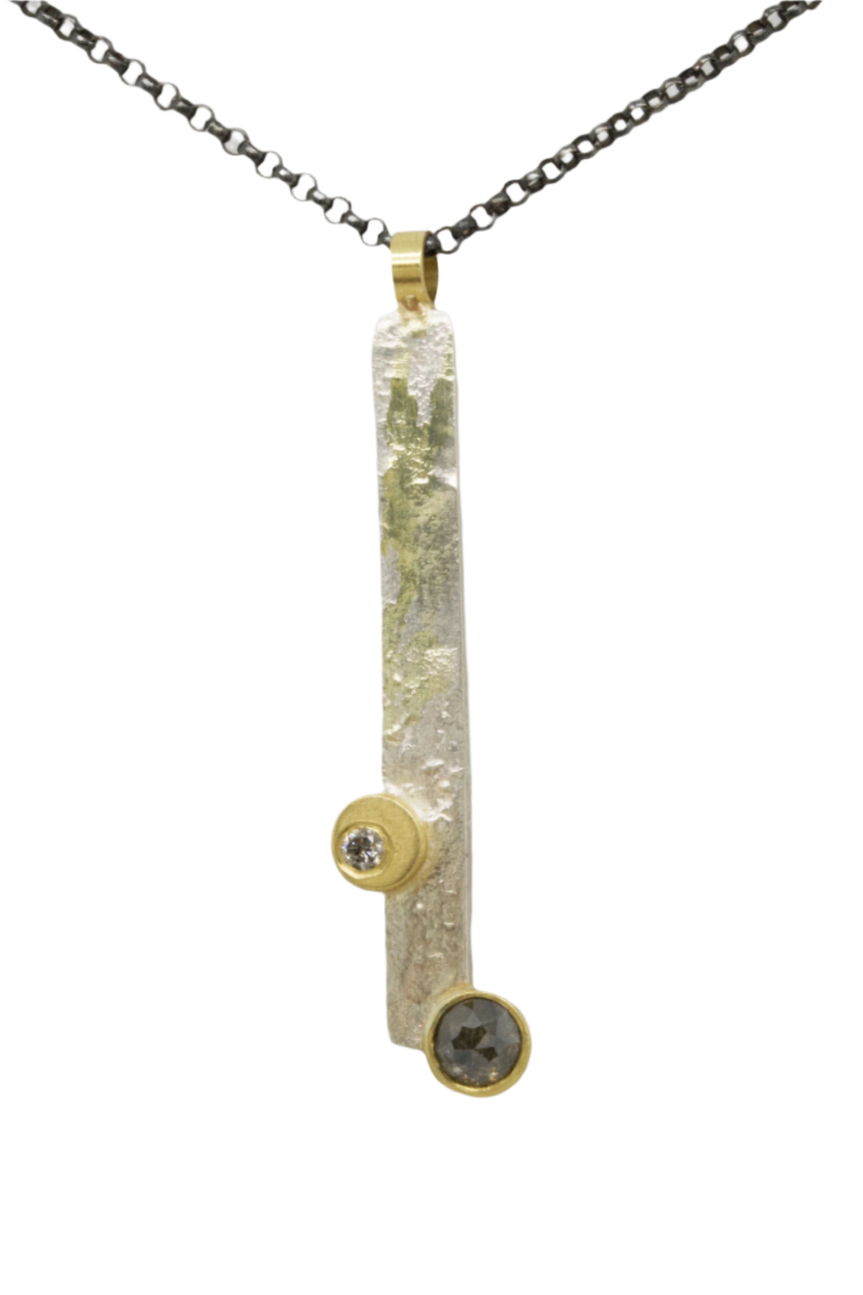 If one salt and pepper diamond is good, two must be great! This necklace has a round brilliant diamond flush set in yellow gold and a rose cut diamond bezel set in yellow gold, all on a strip of sterling silver with gold solder paint. Pop this amazing piece on an oxidized silver chain and you've got something no one else is wearing!