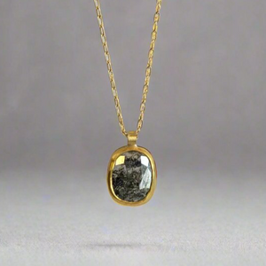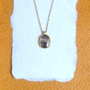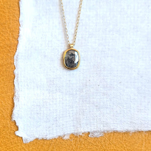 A salt and pepper rose cut diamond in an open back bezel made of 18k yellow gold on a matching gold chain. It's a classic design with a pop of personality.